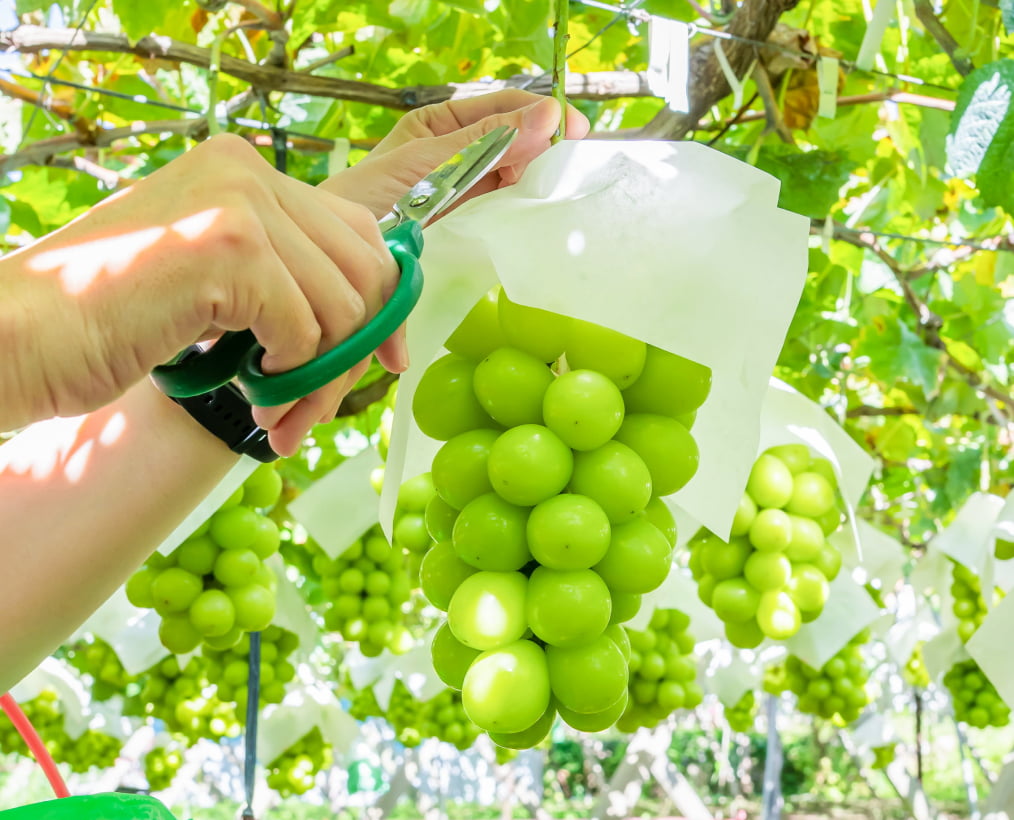 収穫する際は、房の底を手でそっと支え、茎の部分をハサミで切ってください。収穫に必要なハサミなどの道具は農園にご用意しておりますので、特にご準備いただくものはございません。シャインマスカットは粒が落ちてしまうことがあるので優しく丁寧に扱いましょう。