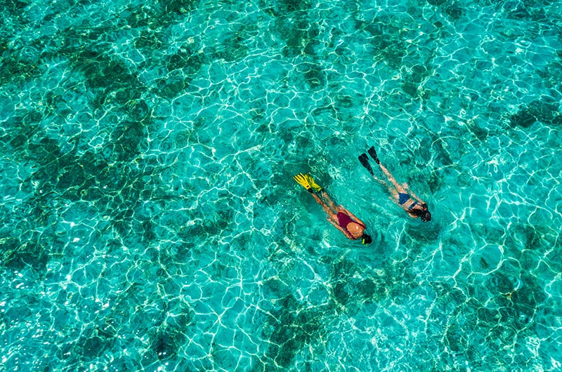 360度独り占め状態の島から僅か数メートルの海の中には魚がいっぱいです。餌付けされているわけでもないのに、人を警戒することなく集まってくる色鮮やかな魚たち。島の美しさはまさに楽園!