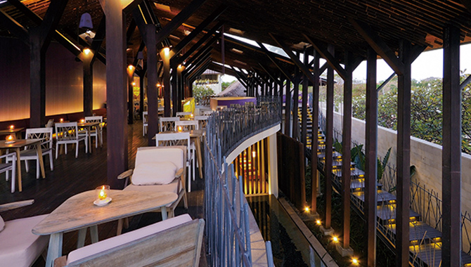 「サバレ」のエントランス2階にあるウッディでスタイリッシュなオープンエアダイニング。