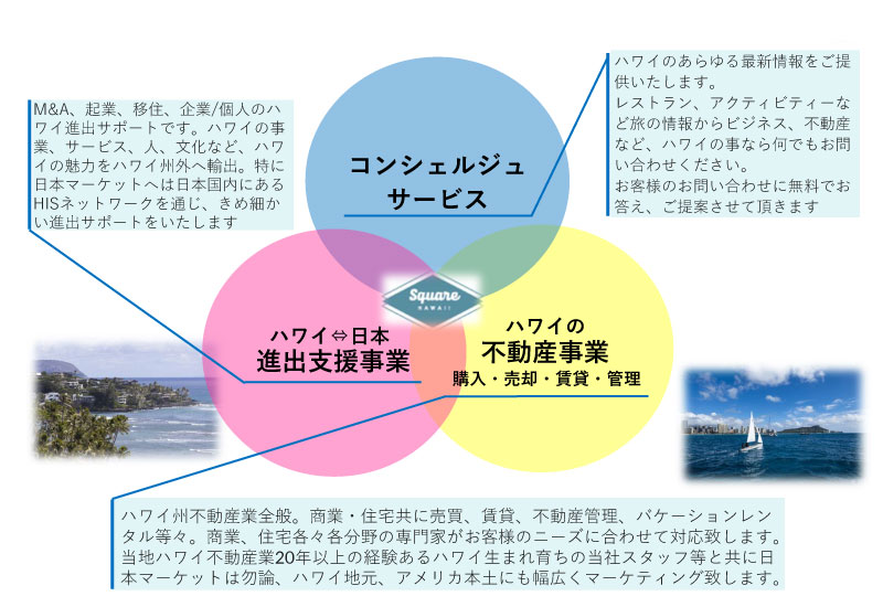 旅行、観光はもちろん、ハワイに家を持ちたい/住みたい(不動産)、ハワイに事業進出したい/起業したいなど、ハワイが大好きだというお客様の様々なご要望や夢の実現をサポートする会社です