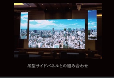 サイズや形状が自由にカスタマイズできるので、会場の大きさに合わせて組みました。映像コンテンツを作り、照明演出を組み合わせる事で迫力のある印象的なシーンに。トップパネル、サイドパネル、小型のサイネージ、フォトスポット等様々な用途があります。