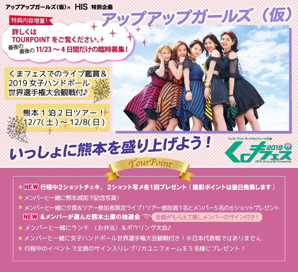 ☆アップアップガールズ(仮)のライブ中は撮影OK☆ ※天候・その他イベントの関係で予定時刻が予告なく変更される場合がございます。 ※ツアー参加者以外の方もご参加されます。 ツアー参加者限定ライブ&夕食会♪