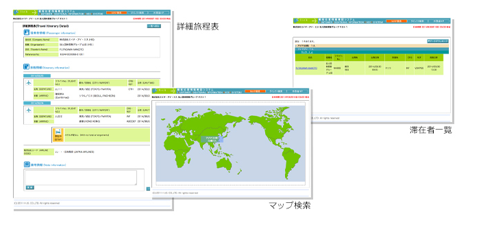 出張者のリアルタイムの位置情報を把握でき、緊急時には安否確認も実施できます。HIS以外で手配した海外出張でも同様に管理可能です。