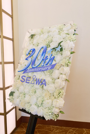 お客様、会社、組織、社員、家庭の5つそれぞれが一つの心となり、お互いに思いやりを持とうという理念のSSV(Seiwa Star Vision)をイメージし制作しました。 30周年ロゴが映えるよう、白を基調とした花は式典後も皆様で楽しめるようにアートフラワーを利用しております。