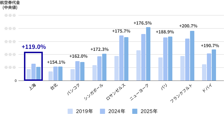 出張需要の高い上海行きを見てみると、航空券代金(中央値)は2019年が88,950円に対して、2025年は105,830円となってます。