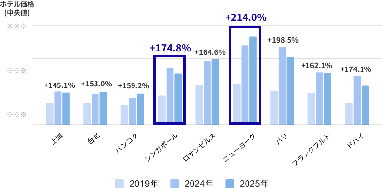 ホテル価格(中央値)も、2019年から2025年にかけて、軒並み大幅な上昇が見られ、高止まりの傾向です。