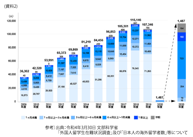 グローバル人材に必要不可欠とされる語学力や国際経験を強化すべく、日本の若者の海外留学を後押しする風潮になっていく中、文部科学省は「スーパーグローバル大学創成支援事業」や「留学促進キャンペーントビタテ留学JAPAN」を推進するなど、若者の海外留学への機運醸成を図ってきました。その結果、世界各地への留学を実現し留学者数が増加していました(資料2)。ところが、2019年度後半に起きた新型コロナウイルス感染症の拡大を受け、ほぼ全世界が感染症危険情報レベル2以上に指定されたことや、各国政府による外国人に対する入国制限等により、留学時期の延期や中止が行われたため、上昇基調にあった日本人の留学者数は2020年度に前年度比98%減となりました。新型コロナウイルス感染拡大の影響を受け、世界中の留学交流が停止し、学生の留学機会が奪われる事態となってしまったのです。