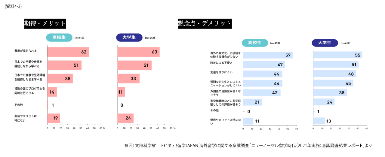 また、新しい派遣留学の形として考えられるのが、ハイブリッド型派遣留学です。その理由は、文部科学省が2021年3月に海外留学に関してインターネット調査した結果(資料4-1~3)からみられます。