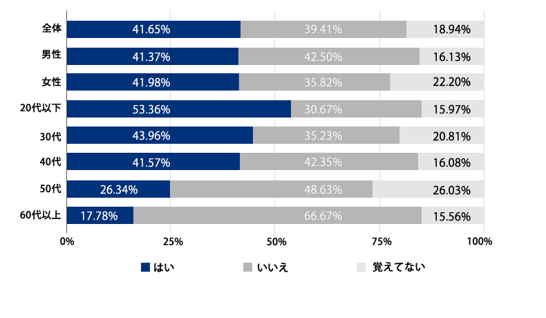 「現在の勤務先に就職する際、福利厚生の内容を確認しましたか」という問いに対して、全体と男女別ではほぼ同割合という結果となりました。 年代別では20代以下が就職前に確認している割合が53.36%と高く、年齢が上がるにつれてその割合は下がり、60代以上では17.78%となり、35%の差が見られました。