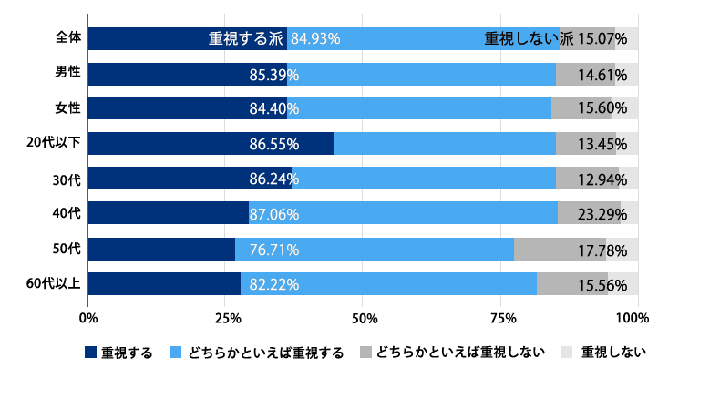 福利厚生をより重視する傾向は、「今後転職する際、福利厚生の内容を重視しますか?」という問いに大きく反映されています。 特に20代以下の重視する割合は86.55%と高く、上記の設問と同様に福利厚生に関する関心が高いことがわかります。また、その他の年代でも約8割が「重視する」と回答していることがわかりました。