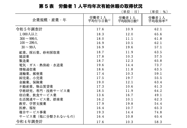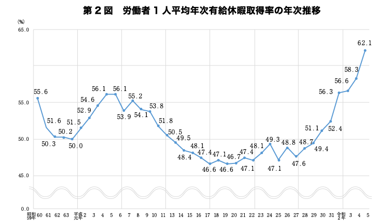 厚生労働省が発表した令和5年就労条件総合調査の概況によると、令和5年の年次有給休暇の平均取得率は62.1%となっています。年次有給休暇の5日取得義務が始まった平成31年4月から大幅に改善され、導入前の平成30年と比較して約5年で11.1%も改善されていることが分かります。