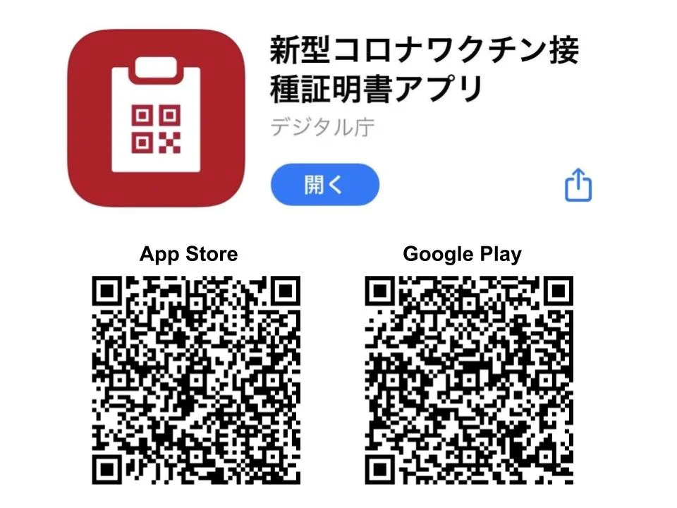「新型コロナワクチン接種証明書アプリ」と検索し、アプリをダウンロード。左記赤いアイコンが目印です!