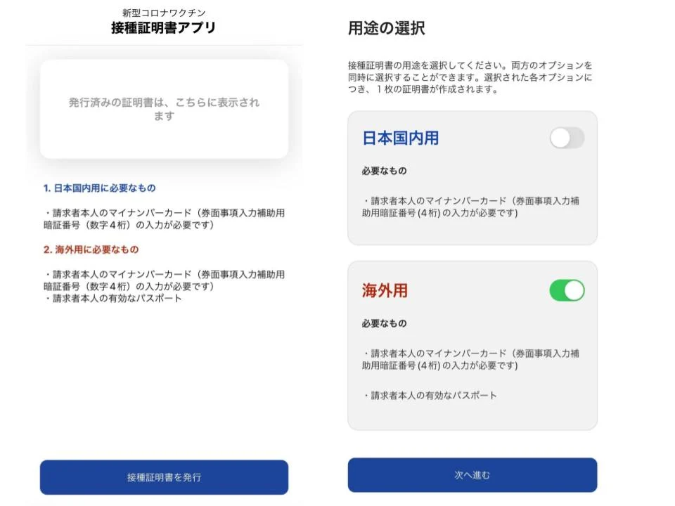 画面下の青色のボタン「接種証明書を発行」をクリックし、ページを進むと発行したい証明書を選択することが可能です。