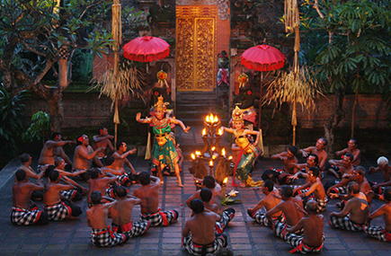 上半身裸の男性ダンサーたちが円陣を組みその中でラーマーヤナ物語が演じられる、独特なスタイルのバリ舞踊の1つです。