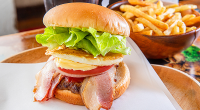 佐世保市発祥のご当地バーガー。米軍基地から伝わったレシピがルーツで、今では地元で愛されるソウルフードに!卵やベーコンなど具だくさんで食べ応え抜群です。