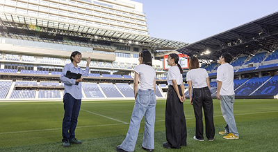 サッカースタジアムを中心に、アリーナ・ホテル・商業施設・オフィスが混在する民間主導の複合施設。試合がない日も楽しめる、長崎の新しい街のシンボルです。