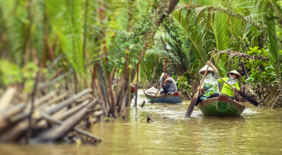 メコン川の豊かな南国自然が体験できるホーチミン人気No.1ツアー!一番のハイライトは手漕ぎボートでのジャングルクルーズ。蛇の首に巻くなどワイルドな体験もできます。