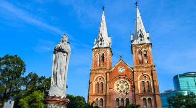 「東洋のプチパリ」と呼ばれるホーチミンのシンボリックなカトリック教会。周囲の公園には花が咲き、マリア教会が正面から写せる絶好の写真スポットとしても人気です。