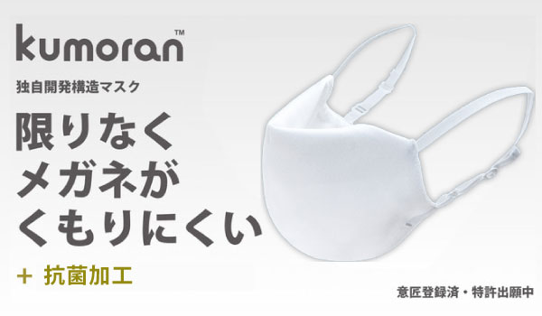 このような皆様のお悩みを解決すべく、弊社では《限りなくメガネが曇りづらい超高機能マスク『kumoran(クモラン)』》を販売しております!
