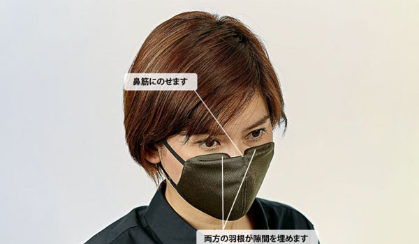 中心のくぼみに鼻筋をはめて羽根を折り返すことにより、頬に隙間無く密着。あらゆる鼻の形にフィットします。