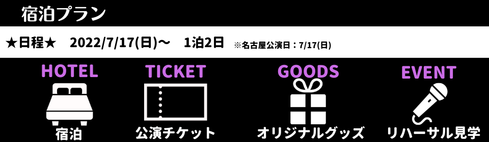 ホテル宿泊費用(7/17 1泊分)、オリジナルグッズ、ツアー限定イベント(7/17)、イベントチケット |