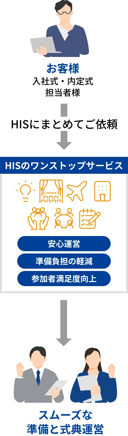 数百社の入社式・内定式を手がけてきたHISのMICE専門担当が、企画立案から当日の運営・進行管理まで一貫してサポートします。
