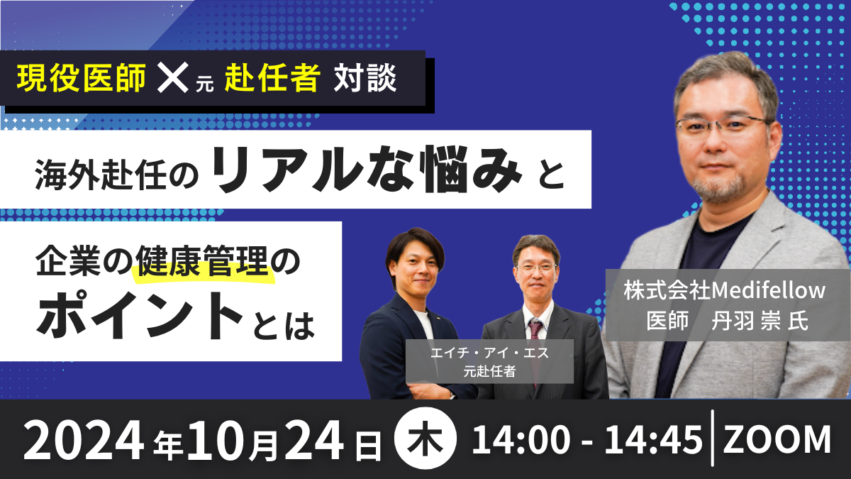 本セミナーでは、現役医師をお招きし、海外赴任者の経験談をもとに、「日本と海外の医療制度の違い」、「帯同家族を含めた海外で陥りやすい心身の不調リスク」、そして企業が整えるヘルスケアのポイントを事例を交えて解説します。