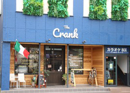 伊豆箱根鉄道修善寺駅西口より徒歩2分というアクセスのよい場所に、紺青色の外壁と、2階の窓を覆うグリーンが目印「ピッツェリア カフェ&バー The Crank(ザ・クランク)」があります。サイクリストフレンドリーなお店の入り口には、スポーツ自転車用のサイクルラックがあり、自転車用工具の貸し出しも行なっていたり、自転車関連グッズも販売しています。