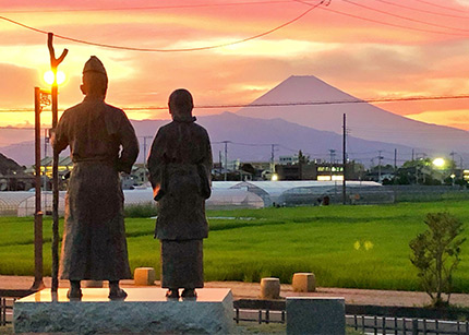 狩野川河口から田子の浦にかけて広がる千本松原は、松の常緑と白雪を頂く富士山、そして駿河湾の彼方に沈む夕陽を望めるといった美しい自然で知られ、多くの文学人に愛され、白砂青松100選にも選ばれた景勝地です。戦国時代には武田氏と後北条氏の戦いで大半が切り払われましたが、名僧・増誉上人が5年以上の歳月をかけて植え直したと伝えられています。