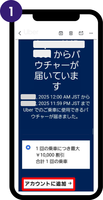ご登録のメールアドレスにUber バウチャーが届きます。[アカウントに追加→] をクリックしバウチャーを Uberアカウントへ適用します。