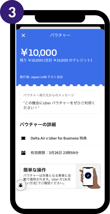 金額や利用条件を自由に設定し利用者がスムーズにUberをご利用いただくためのバウチャーを発行いたします。