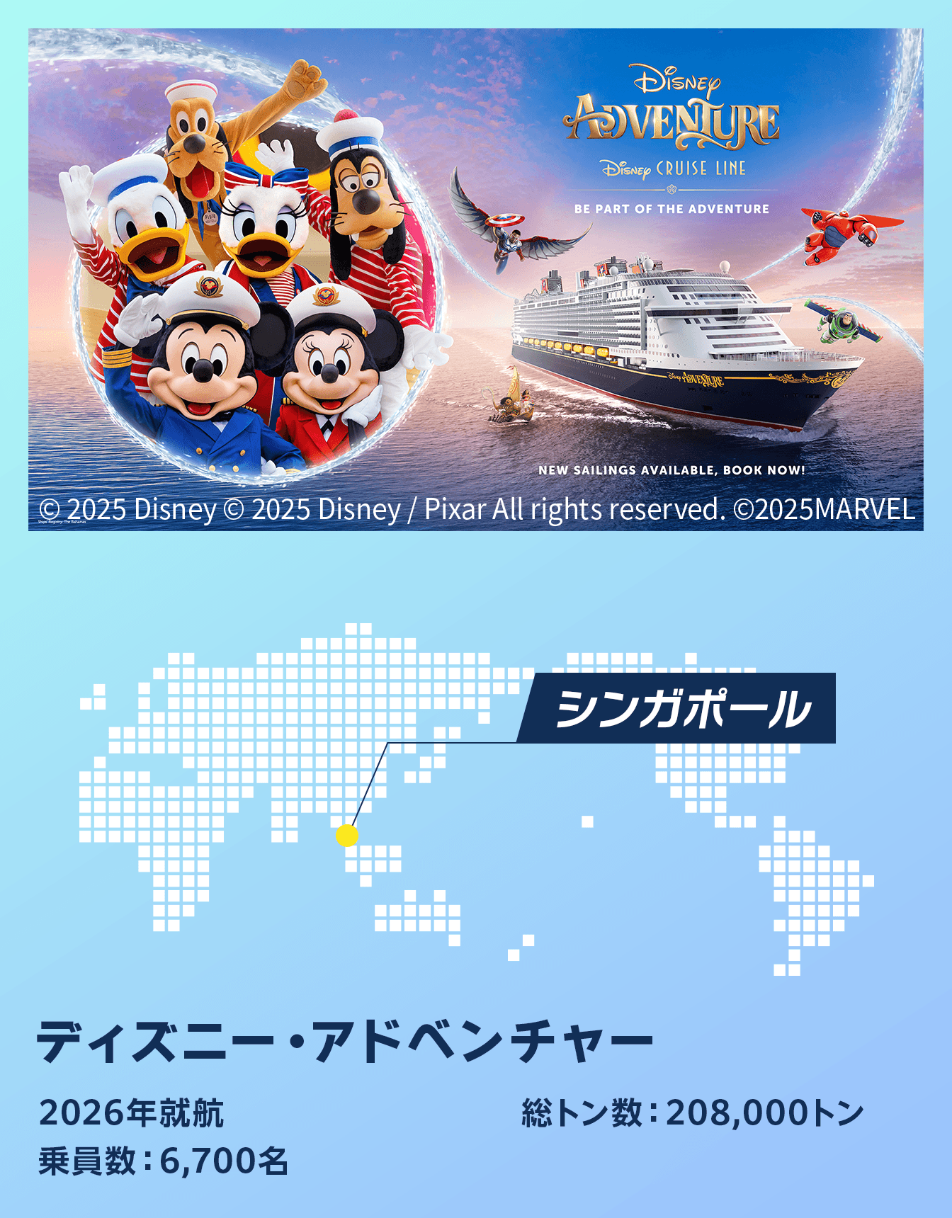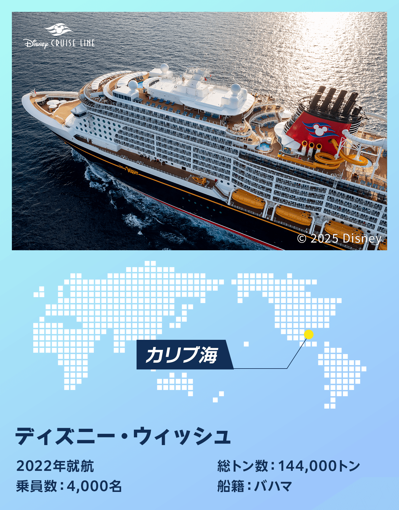 HISでは、カリブ海のプライベートアイランド「ディズニー・キャスタウェイ・ケイ」に寄港する「ディズニー・ウィッシュ」と、2026年にアジア発となるシンガポールを発着する「ディズニー・アドベンチャー」、アールデコ調の内装が人気の「ディズニー・ワンダー」を取り扱っています。もちろん航空券込みでご案内しています。また、世界各地にネットワークのあるHISでは現地でのサポートも充実、より安心した船旅を提供します。