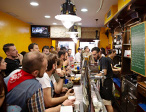 サンセバスチャンの人気店。地下にもレストランが広がっているが、お客さんは入り口付近のカウンターや店の外に並ぶテーブルで肩を並べ、ピンチョス、チャコリや赤ワインなどを楽しむ。 -