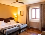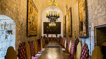 10世紀の古城を利用したホテル。まるで映画のような城内とは対照的にモダンな客室、植物が並ぶ美しい中庭のテラス、そこから臨む雄大な景色はまさに圧巻です。
