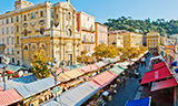 ニースの中心にある広場。噴水前はニース観光の記念写真用モニュメントも設置されたフォトスポット。大きな広場を囲むように7体の人物像アートがあるのも見逃せません。