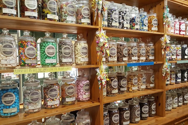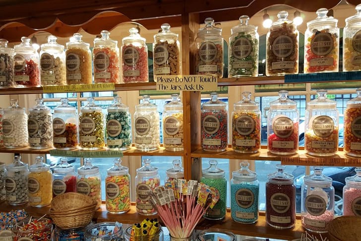 バーフォード スウィートショップ丘陵に沿った坂道のハイ・ストリートに、アンティークショップや雑貨店、カフェやパブが軒を連ねます。お土産用の特に可愛らしい柄にパックされたスイーツが有名で人気があります。 -