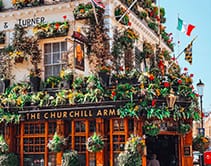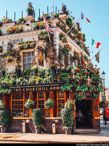 チャーチル・アームス花や緑、万国旗満開の外観がフォトジェニックな、ロンドンのランドマーク的存在。内装はクラシックなイングリッシュパブで、地元の常連客で賑わっています。英国パブでタイ料理が楽しめることで人気です。 -