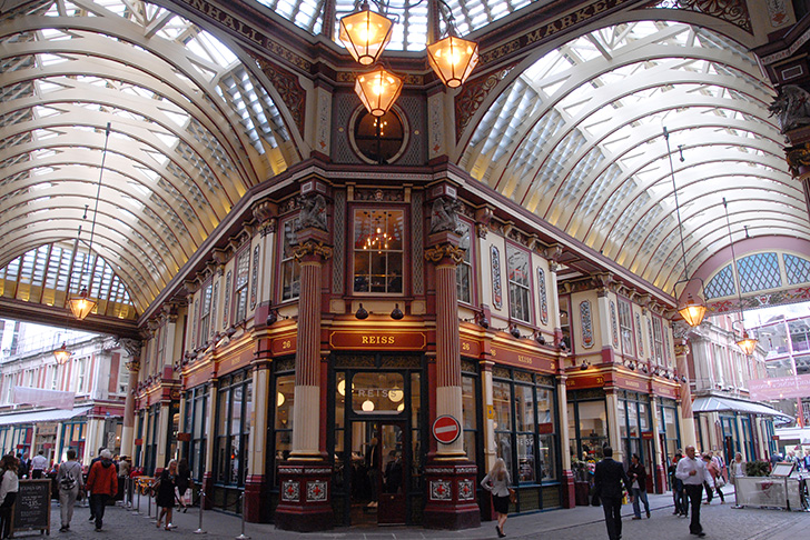 レデンホール・マーケット19世紀ヴィクトリア時代の面影を残す、全天候型のマーケット。レストランやショップが軒を連ね、映画「ハリー・ポッター」シリーズのダイアゴン横町のモデルにもなっています。魔法使いのパブ「割れ鍋」のロケ地は、青い外観の眼鏡店。 -