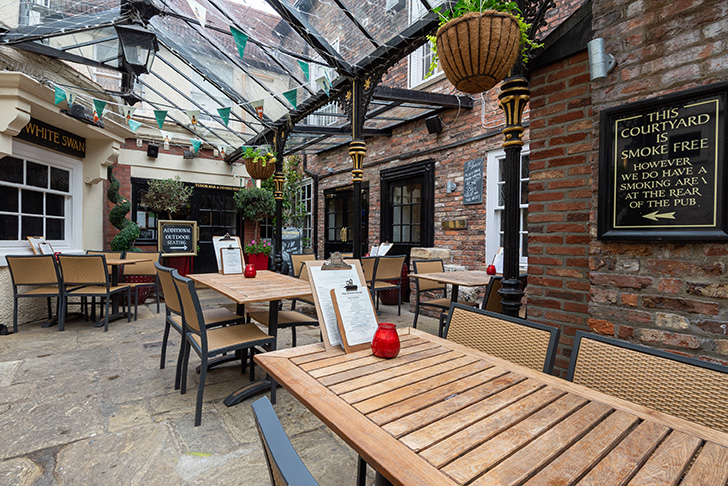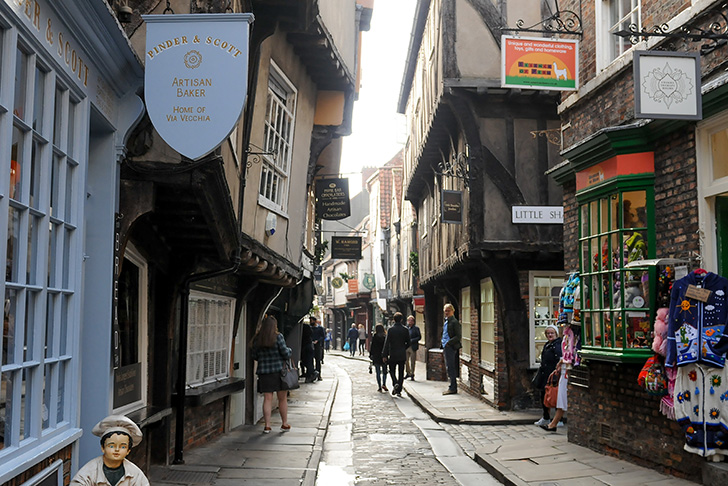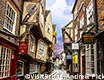 シャンブルズ通りとウース川岸の風景中世の面影をそのまま残す「シャンブルズ通り」は、ヨークでもっとも有名な石畳の路地。上階にいくほど突き出しているユニークな建物が軒を連ねています。ウース川の河畔からシャンブルズ、ヨーク大聖堂へと散策を楽しんで。 -