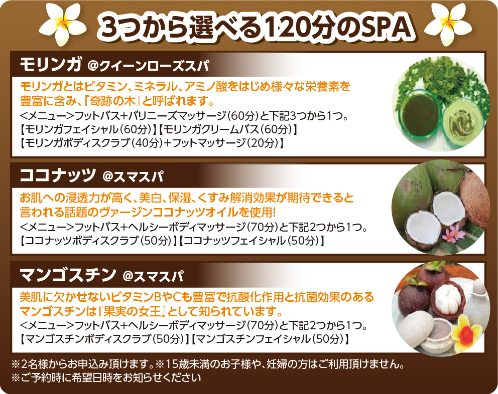 ・モリンガ:クイーンローズスパ 8:00~14:00 ・ココナッツ、マンゴスチン:スマスパ 10:00~14:00 ※予約状況によりご希望のお時間での手配が不可となる場合があるので、ご要望をお伝え頂く際は第3希望のお時間までお伝えください。 ※オンライン予約でお申込みをする場合は、ご予約後マイページよりメッセージにてご希望をお伝えください。