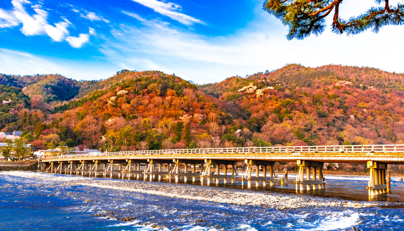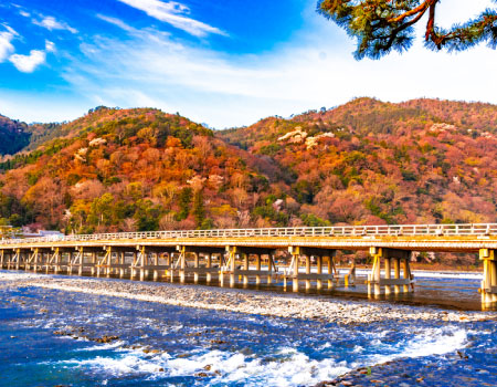 Arashiyama is one of the popular sightseeing spots in Kyoto. The area has famous places like Togetsu Bridge, the bamboo forest, and Kimono Forest, all with beautiful fall colors.