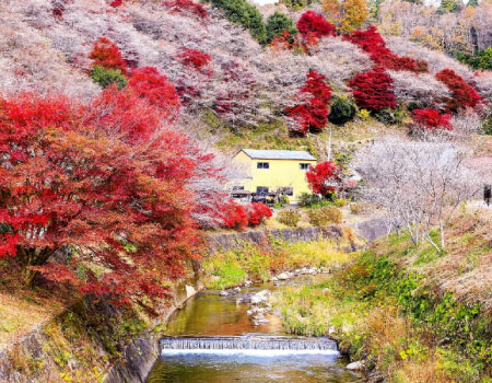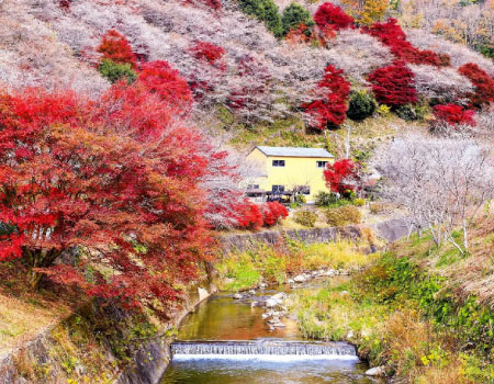 Shikizakura is a rare cherry blossom tree, which blooms twice a year, in spring and autumn. And Obara is an area where you can enjoy "beautiful collaboration of red and white".