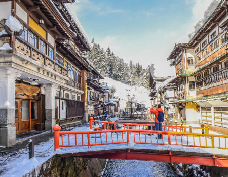 Ginzan Onsen, known as one of the finest hot springs in Yamagata Prefecture, is a charming hot spring town adorned with retro-style inns that were built during the Taisho and Showa periods. The town exudes a nostalgic atmosphere that is sure to captivate visitors.
