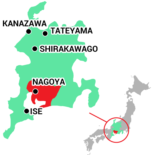 這個地區有日本三大城市之一的名古屋,世界遺產白川鄉、五箇山、留有武士文化的金澤、飛騨、木曾等四季絕美的高山山脈,還有其他許多引人入勝的景色。