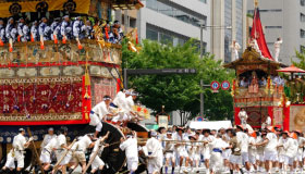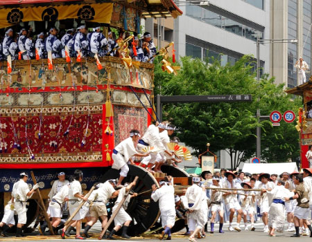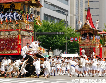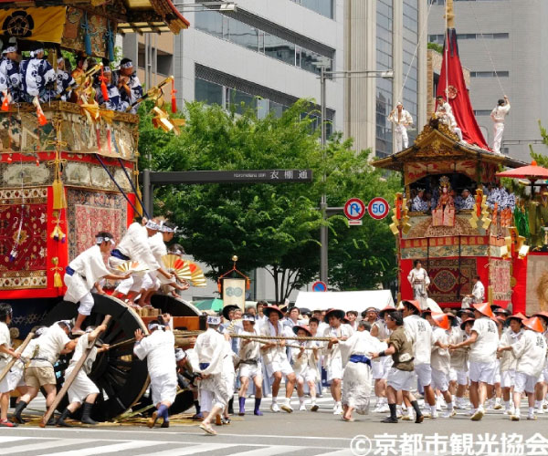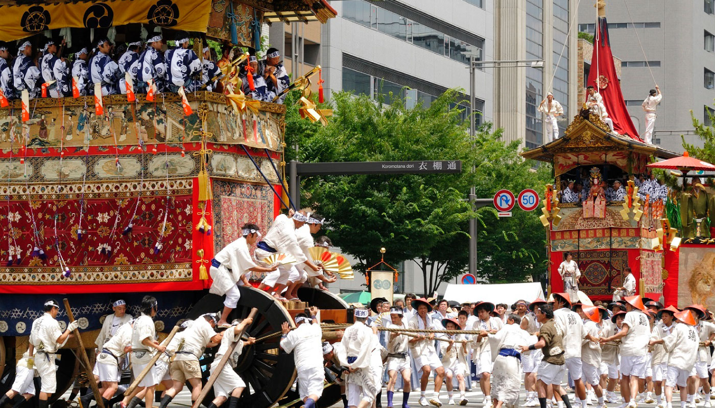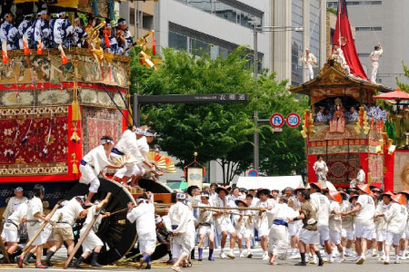 這個祭典會將整座京都市變成一個大型派對,特別是在七月中,當精緻裝飾的沉重花車向公眾展示,然後在街上遊行的這兩個時期,氣氛更是熱鬧。