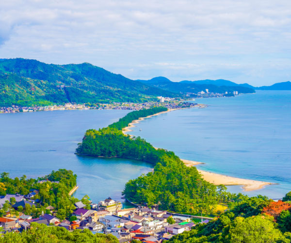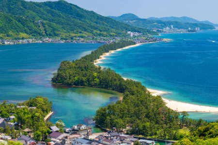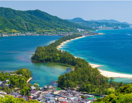 - 天橋立是一個橫跨宮津灣入海口的沙洲。從山上眺望,天橋立沙洲在日文意為「天堂之橋」,看起來像是天堂與地球之間的通道。這個景觀被評為日本三大名勝之一。