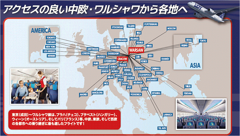 LOT(ロット)ポーランド航空は、90年以上の歴史があり、中東欧を代表する航空会社です。2019年にはご利用いただいたお客様の総数が10憶人を超えました。LOTのハブ空港であるワルシャワ・ショパン空港から欧州各都市、中東、北米、アジアへ約100都市に幅広いネットワークを構築しています。また26社*が加盟する航空連合、スターアライアンスのメンバーです。連携航空会社間でのマイレージの加算、ビジネスラウンジの利用等、魅力ある特典がご利用いただけます。
