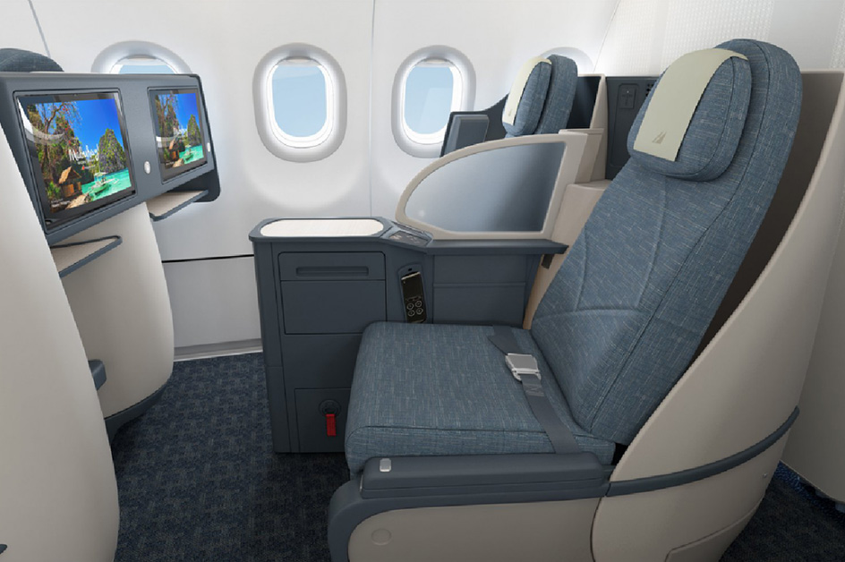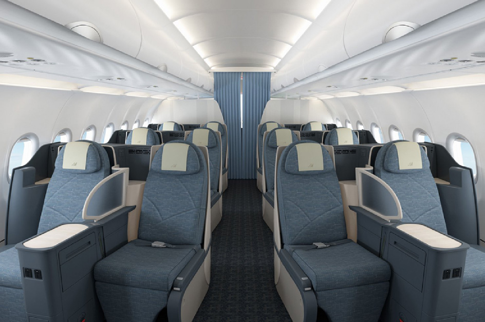全12席のシートは180度背もたれが倒れるフルフラットシートと個人用モニターが完備されており快適なフライトをお楽しみいただけます(直行臨時便は使用機材が異なります)。