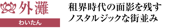 黄浦江(こうほこう)の西岸に位置する外灘は、通称「バンド」と呼ばれる上海を代表する観光地。租界時代の歴史的建造物が通り沿いに並び、当時の面影を色濃く残している。かつては列強各国の企業や銀行などが進出し、「東方のウォール街」と呼ばれるほど経済の中心地として栄えた。パレス・ホテルなど, 社交場として一時代を築いた建物も当時の姿のまま残っており、上海の歴史を語る上で外せないのがこのエリアである。多くのビルは現在リノベーションされ、レストランやブティックなどとして使用されており、街並みだけでなく、グルメやショッピングも楽しめる。訪れるなら、明るい時間も素敵だが、ライトアップされる夜が断然おすすめ。アールデコ様式やネオバロック様式のビル群が照らし出される様は、幻想的で息を呑むほど美しい。