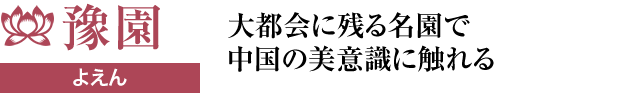 明代に、四川省の役人だった潘允瑞(はんいんたん)が、故郷を懐かしむ両親を慰めるために建設した庭園。造園にはなんと18年間もの歳月がかかったと言われており、「江南随一の名園」と賞されている。名前の由来は、「豫悦老親」という中国の言葉にちなんでおり、「豫悦」は喜ぶ、「老」は老いるという意味で年老いた親を喜ばせるという意味が込められている。潘家の没落後、庭園は一時荒廃したものの、清代になってから上海の有力者たちが再建に乗り出し、現在の姿が一般に開放されたのは、1956年の大改修以降のこと。面積は、往時のほぼ半分である約2万㎡で、江南様式の特徴である池や回廊などが多用されている。
